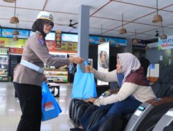 Kali ini, Wakapolres Ngawi Kompol Rizki Santoso, S.I.K., bersama Polisi Wanita (Polwan) Polres Ngawi membagikan bingkisan kepada para pemudik yang sedang beristirahat di Rest Area KM 575A.
