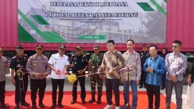 Prosesi peresmian ditandai dengan pemasangan tanda Bea Cukai sebagai simbol legalitas ekspor, dilanjutkan pemotongan pita dan pelepasan armada truk pengangkut produk menuju pelabuhan.